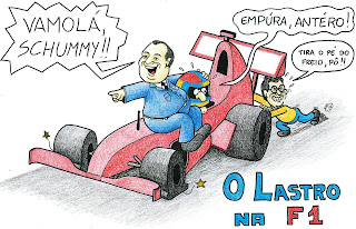 Nesta outra, outros dois personagens da emissora ao lado de Michael Schumacher. Na época, como o alemão estava vencendo quase todas, aventou-se a possibilidade de se acrescentar um peso (lastro) no carro por cada vitória. O intuito era salvar a F1 da monotonia causada por Schummy.