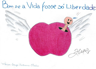 Usando três temas (AMOR, LIBERDADE E ESPORTE), pedi para minhas 5ªs e 6ªs séries criarem cartuns com o Bichinho da Maçã. Mostrei uma dezena de exemplos e, com toda a paciência e dedicação por parte deles, saíram dezenas de verdadeiras pérolas.