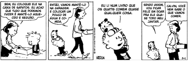 Tantas e tantas tirinhas deles são a síntese da minha infância. Calvin, sempre um moleque sonhador, faz o que toda criança quer: transpõe a realidade para sua idiossincrasia. Eterna e intensamente insatisfeito, tenta se libertar das regras sisudas e intransigentes do mundo, dá vida ao seu tigre de pelúcia, singra o espaço sideral, vai à pré-história ou a traz para o hoje,... Tenta fazer o mundo ser seu mundo.